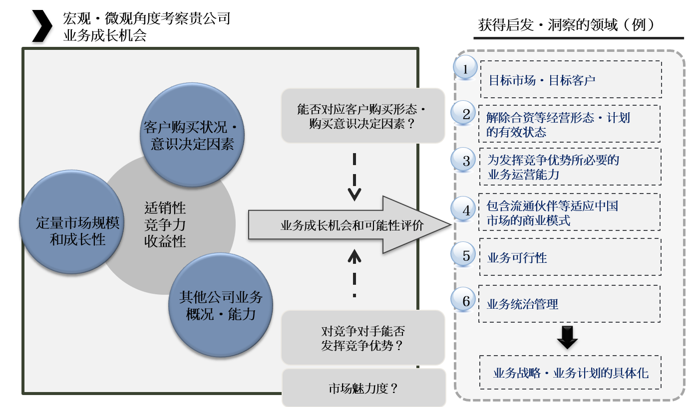 进入新市场和战略制定中,虽然依靠每天的感觉、信息和判断,但是否足够的妥当性是进行客观分析和调查来实证。虽然战略中发挥主动性,但是错综